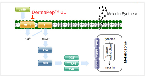Alpha-MSH, melanocyte stimulating hormone, is best known as major factor in the regulation of pigmentation through its unique mechanism. Alpha-MSH involves in the control of tyrosinase activity, melanin synthesis and melanosome transfer. DermaPep™ UL interacts with MC1R, a receptor for alpha-MSH, competes against its natural ligand, alpha-MSH and thereby prevents any further activation of melanogenic genes such as tyrosinase, TRP1, TRP2 (DCT), MITF and POMC and finally blocks melanin synthesis.