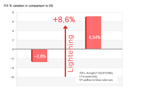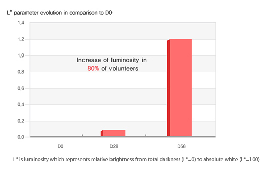 The clinical test was performed on 30 Asian volunteers (Bangkok), aged 18 to 52 (Mean age 32). 3% formula containing DermaPep™ UL has been applied twice a day during 56 days, on face area. Evaluation was performed by chromametry (chromameter CR-300®, Minolta, Japan).