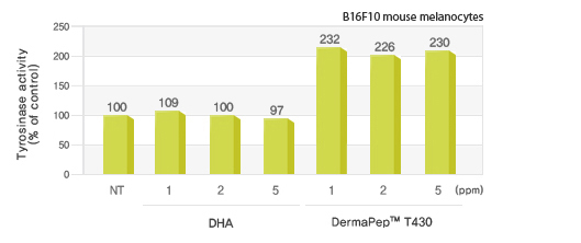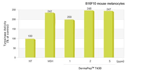 DermaPep™ T430 functions as a MC1R-specific agonist and increase tyrosinase, TRP1, TRP2, MITF and POMC gene expression (supplementary data were not shown). DermaPep™ T430 significantly up regulates melanogenesis (melanin formation) and tyrosinase activity.