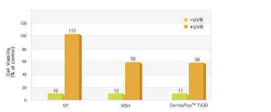 DermaPep™ T430 was treated before UVB irradiation on HaCaT human keratinocytes. DermaPep™ T430 dramatically reduced inflammatory cytokines (IL-1 α, IL-1 β, IL-6 and PGES).