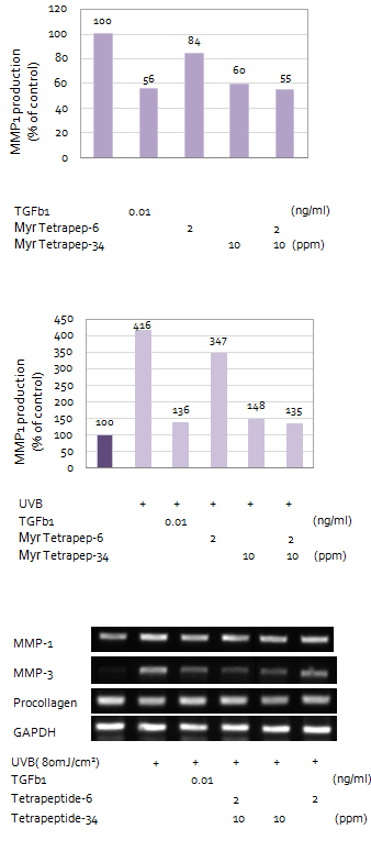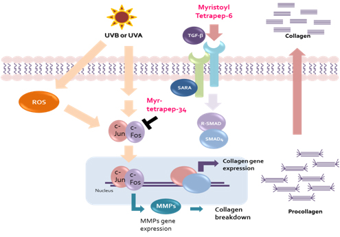 The enzyme called MMPs are mainly responsible for collagen breakdown and inhibition of new collagen formation in the skin. Exposure of the skin to UV radiation results in the upregulation of several different MMPs and the repeated upregulation of these collagen-degrading enzymes over time is thought to underlie the collagen damage that is one of the hallmarks of photoaging. Transforming growth factor (TGF-β), a member of a large family of secreted peptide growth factors, is known to play a prominent role in the accumulation of ECM (extracellular matrix) components by increasing the expression of ECM genes, such as collagen, elastin, fibronectin and proteoglycan.