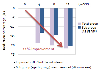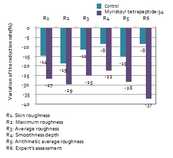 In a clinical study with 21 Asian healthy female volunteers (Korea), aged 30 to 65, 2 % formula containing Myrisoyl tetrapeptide-34 had been applied twice daily during 12 weeks on the face area. Evaluation was performed by Transparancyprofilometry analysis using visiometerSV600(Courage-Khazaka electronic GmbH, Germany) and digital photography.