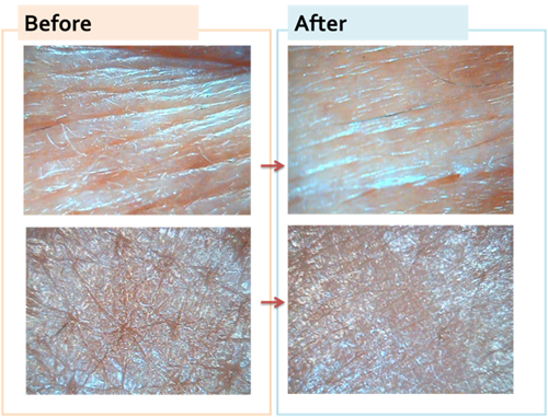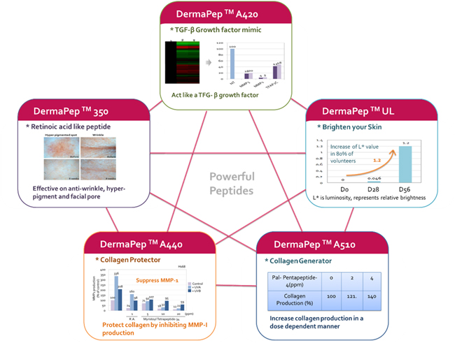 DermaPepTM Youcel shows real effect on hydro-lifting as well as skin brightening. This product is a blend of 5 super powerful peptides in golden ratio. DermaPep TM 350, known as retinoic acid like peptide, shows anti-wrinkle. DermaPep TM 420, a TGF-beta mimic, gives effect on regeneration and anti-aging of skin. DermaPep TM 440, known as collagen protector, inhibits collagen breakdown by suppressing collagen-degrading enzyme (MMPs). DermaPep TM 510, a collagen producer, induces collagen production. DermaPep TM UL, a skin brighter, lighten up your skin by inhibiting melanin production in melanocyte under the skin.